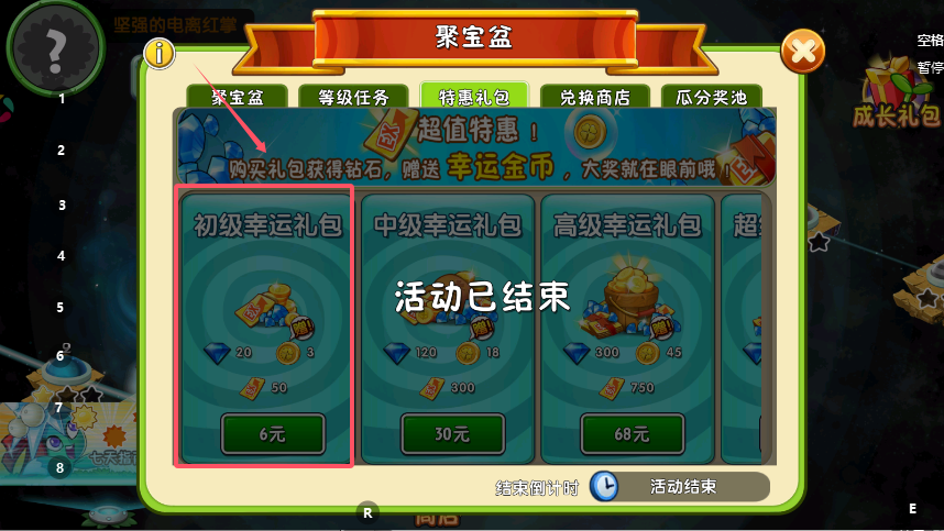 4、在特惠礼包处选购不同价位的礼包,获取钻石与幸运金币,再到兑换商店用幸运金币兑换植物进阶书、金币等道具,兑换时需注意各道具的消耗数量与限购次数。