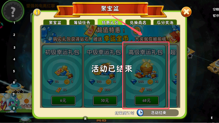 4、通过特惠礼包购买不同档位的礼包,得到钻石与幸运金币,再前往兑换商店,用幸运金币兑换植物进阶书、培养液等道具,注意部分道具存在兑换次数限制。