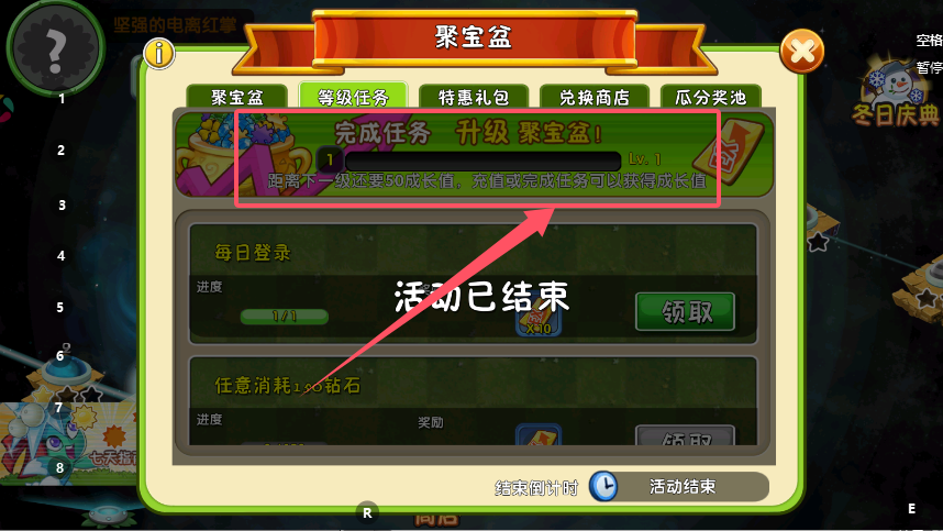 3、在等级任务页面,完成每日登录、消耗钻石等任务获取成长值,成长值达到要求即可升级聚宝盆,升级后可解锁更多奖励权益,任务进度会实时更新便于查看完成情况。