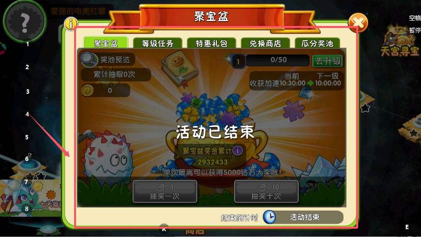 2、切换至聚宝盆主界面,可选择单次或十次抽奖,抽奖后会积累次数用于提升名次,同时聚宝盆等级可通过完成任务或充值成长值升级,等级提升能加快收获奖励的速度。