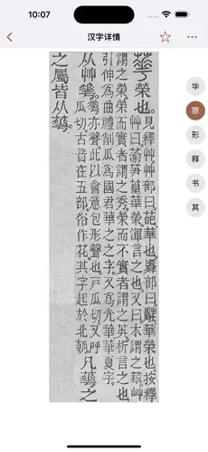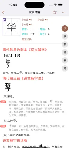 说文解字是一款专为汉字学习设计的实用工具,整合《说文解字》的经典内容,提供全面的汉字解析。可以通过输入汉字或拼音快速查询,获取拼音、笔画、部首、结构、五笔编码等信息,还能查看田字格中的标准书写示范和发音功能,帮助掌握正确笔顺和读音。支持多种查询方式,包括按部首、拼音或智能查词,并收录清代陈昌治刻本的原文与现代译文对照,方便理解汉字的历史演变和文化内涵。具备收藏功能、查询历史记录和离线使用,操作简单直观,适合古汉语爱好者或普通用户随时随地学习汉字。