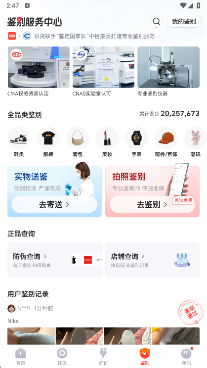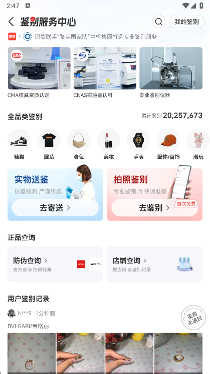 识货App与中检集团奢侈品鉴定中心达成战略合作,识货收录的合作店铺均支持识货鉴别服务。