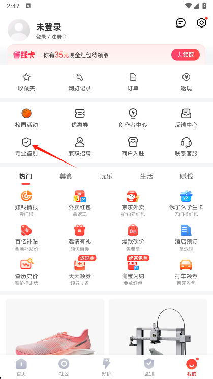 2、在识货工具栏处,点击专业鉴别,选择实物鉴别
