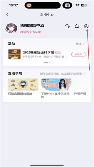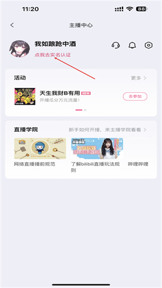 2、进入主播中心的页面内,点击下方点我去实名认证的区域。
