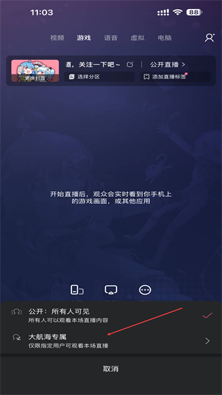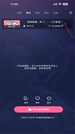 2、进入游戏直播的页面内,找到并点击公开直播的按钮。
