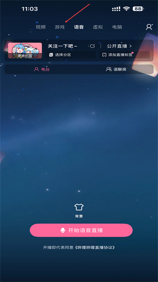 1、启动哔哩哔哩直播姬,点击上方语音的标签。