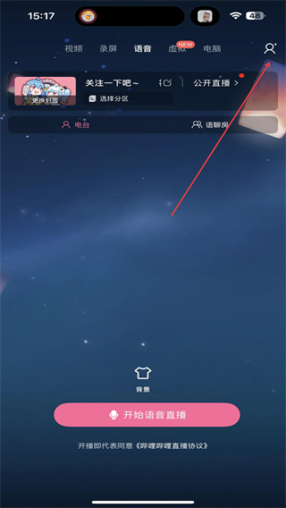 1、打开哔哩哔哩直播姬App,在首页右上方点击人像的按钮。
