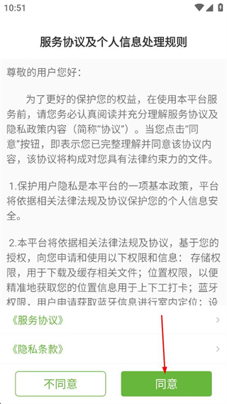 1、查看服务协议及个人信息处理规则内容,点击界面中的同意按钮,进入登录页面。