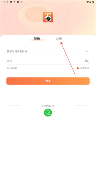 1、打开看护家的应用APP,进入时点击登录右侧注册的按钮。
