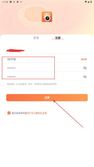 3、将收到的验证码输入其中后,再输入密码点击注册。