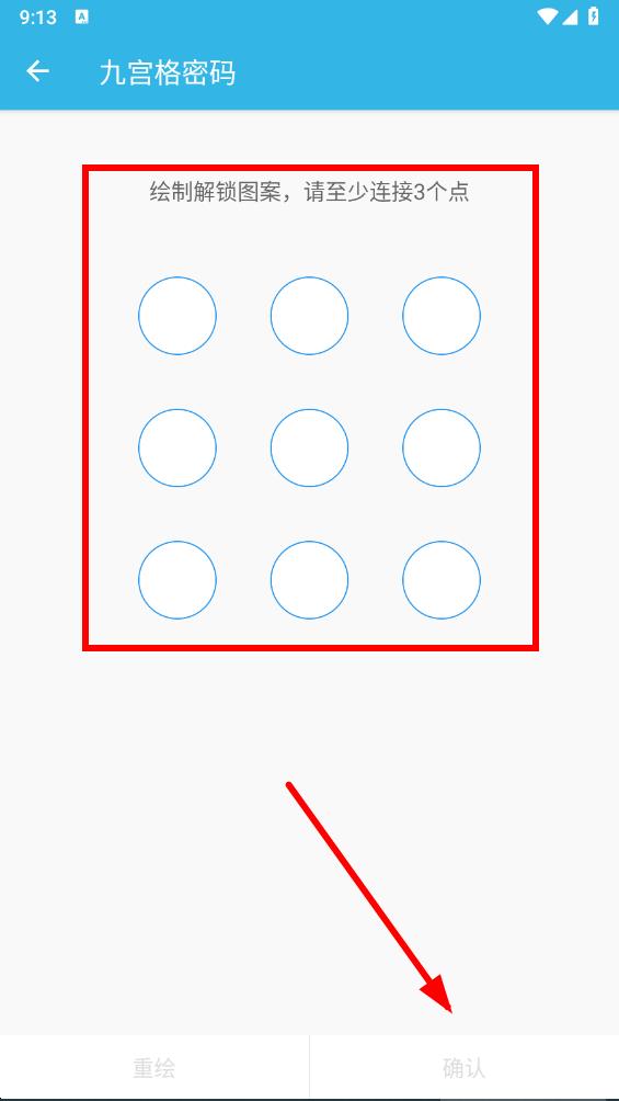 4、在九宫格密码设置界面,按照要求绘制解锁图案,确保至少连接3个点,绘制完成后点击确认,即可成功设置密码锁屏。