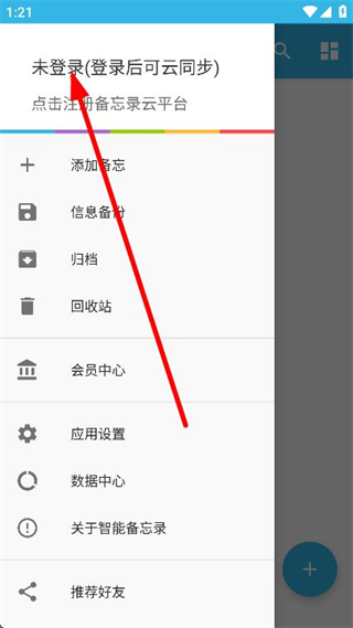 1、打开智能备忘录软件,点击界面左上角三条横线图标,唤出侧边隐藏菜单。