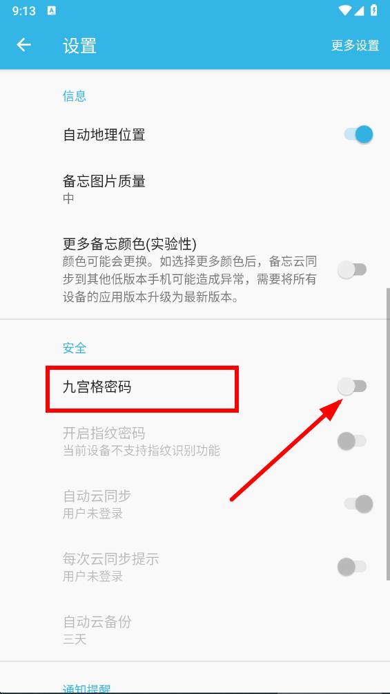 3、在设置页面的安全区域,找到九宫格密码选项,点击其右侧开关将其开启,准备设置密码。