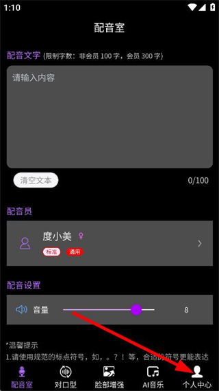 1、打开对口型视频配音大师,点击底部个人中心选项。
