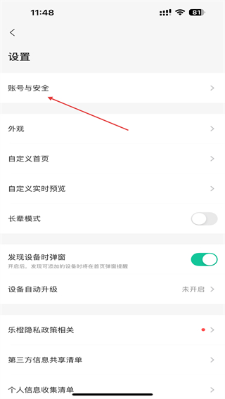 3、在设置的页面内,点击上方账号与安全的按钮。