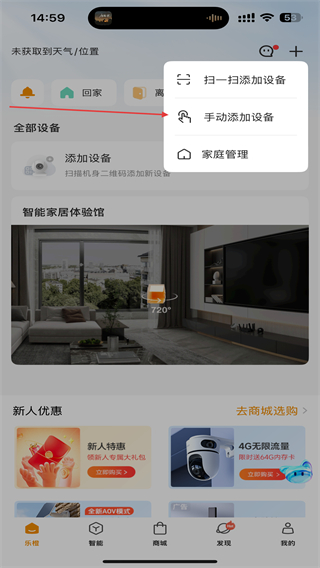 2、在弹出的菜单栏中,用户需点击手动添加设备的按钮。