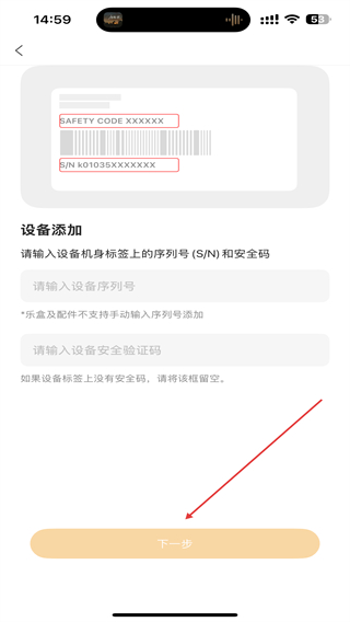 4、在设备添加的界面内,输入序列号、验证码,再点击下一步即可。
