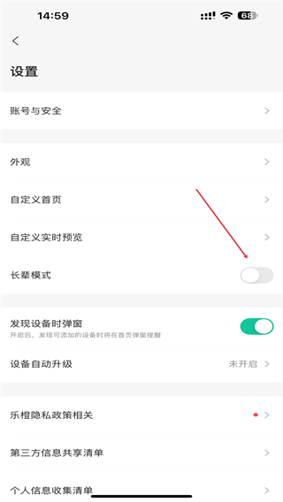 3、在设置页面里,找到长辈模式对应的开关,点击开关即可开启。