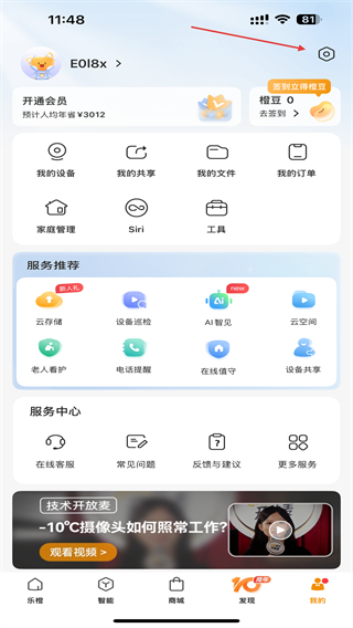 1、打开乐橙监控的应用,在首页右上点击头像的图标。