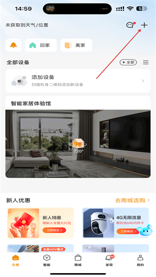 1、启动乐橙监控的应用APP,在首页右上角点击+的功能按钮。