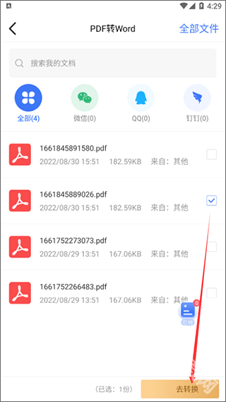 2、根据自己的需求选择需要用到的功能进入,如PDF转Word,选择需要转换的文件,点击“去转换”;