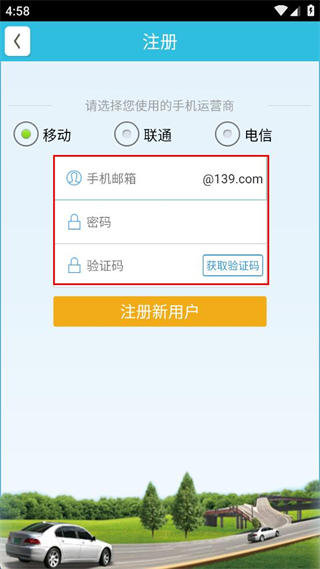 3、在注册页面选择手机运营商,填写手机邮箱、密码并获取验证码。