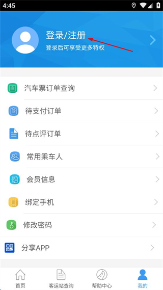 2、在个人中心页面找到登录/注册选项,点击后跳转至登录界面。