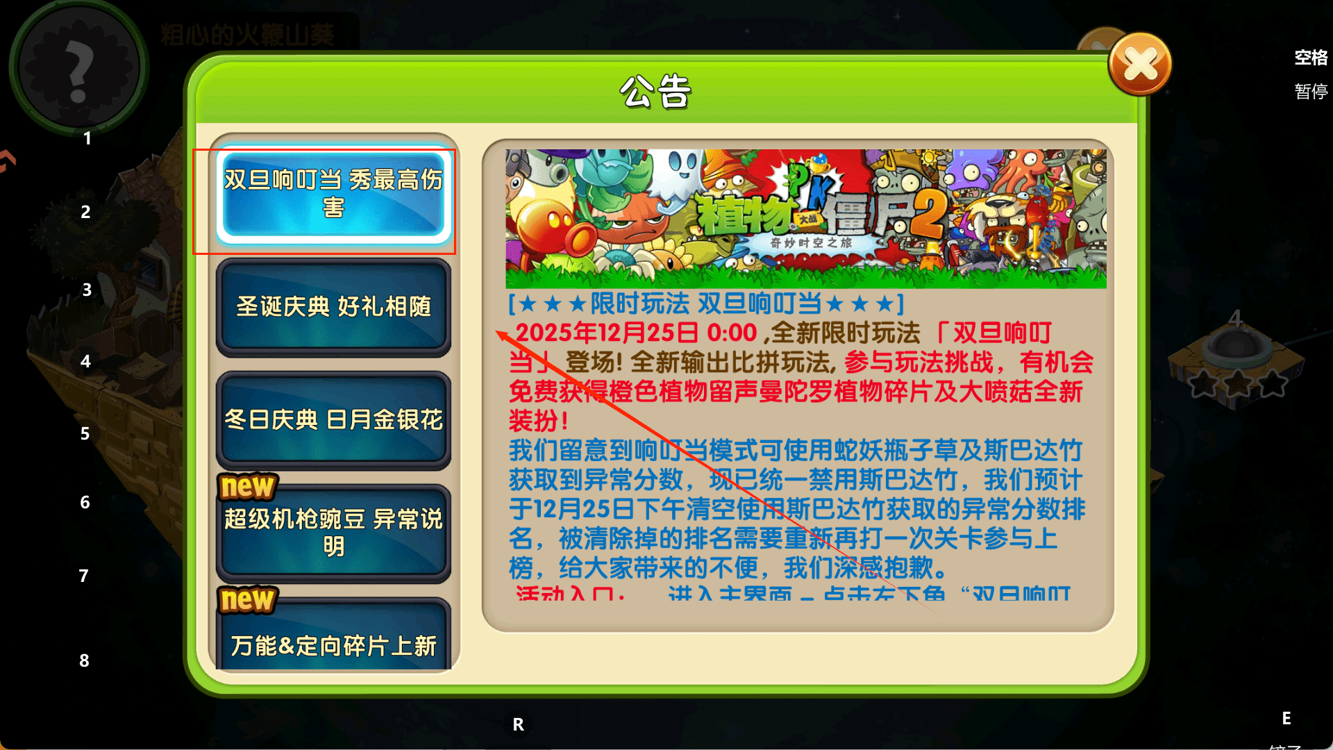 3、除了主活动,公告左侧列表里还链接着“双旦响叮当”、“圣诞庆典”等丰富的子活动,分别点进去参与,能拿到各种植物碎片、装扮等限时奖励。