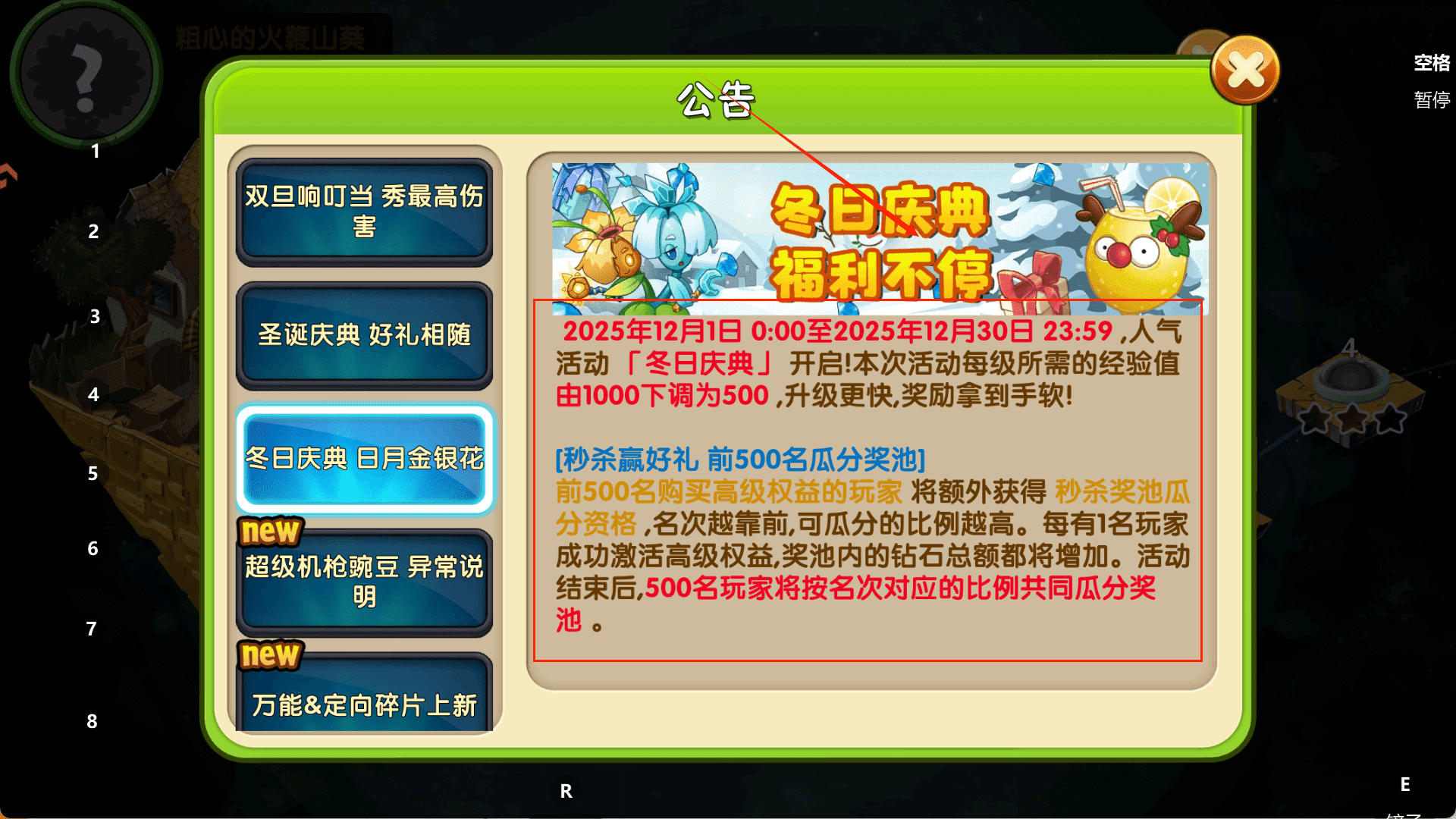 1、从12月1日到30日,记得去“公告”栏参加“冬日庆典”活动,这期间升级所需的经验值直接减半,是你快速提升游戏等级、解锁新内容的好机会。