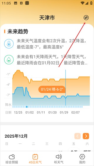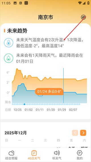 2、可查看未来天气趋势与温度变化,点击右上角按钮打开城市选择界面。