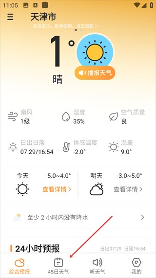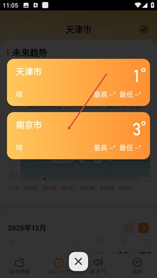 1、进入首页,点击底部【45日天气】选项,进入长期天气预报页面。