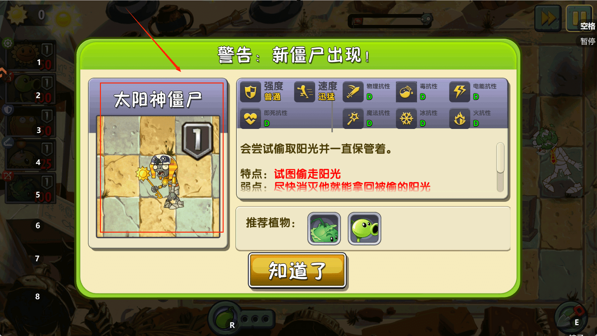 1、遇到太阳神僵尸,优先使用推荐的豌豆射手或卷心菜投手,快速消灭它以恢复阳光。