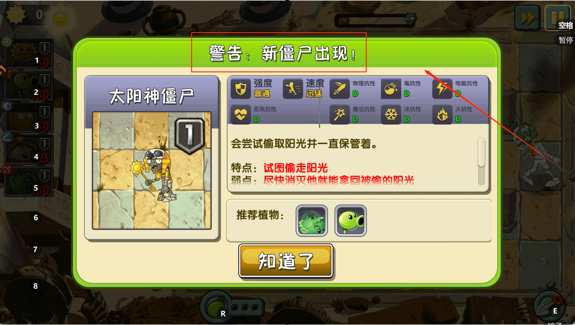 1、当太阳神僵尸出现时,使用推荐植物迅速消灭它,以拿回被偷的阳光并继续游戏。