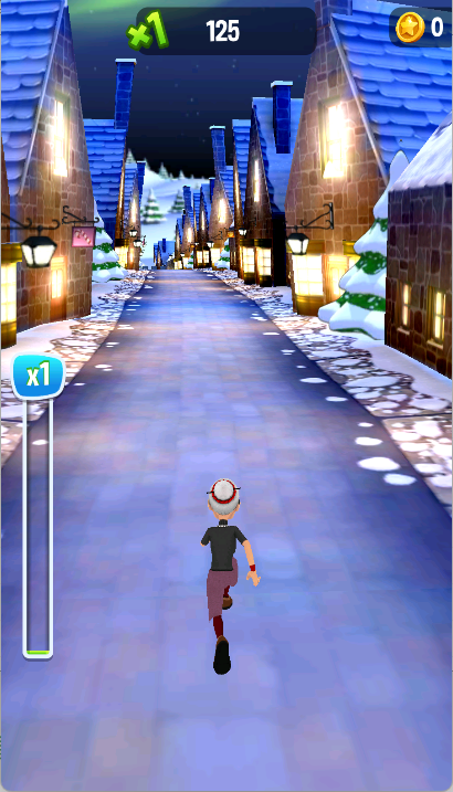 4、通过虚拟摇杆控制老奶奶移动,点击跳跃、滑行等按键避开障碍物并收集道具。