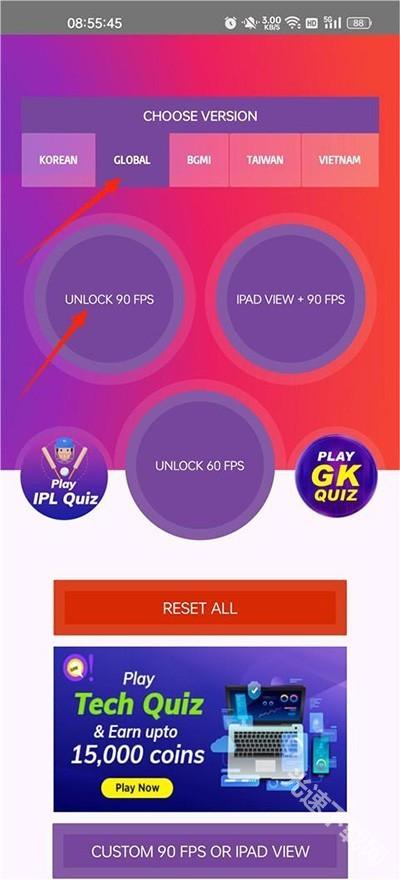 1、启动90fps画质助手中文版后,首先选择全局模式(global),然后点击解锁90帧模式。