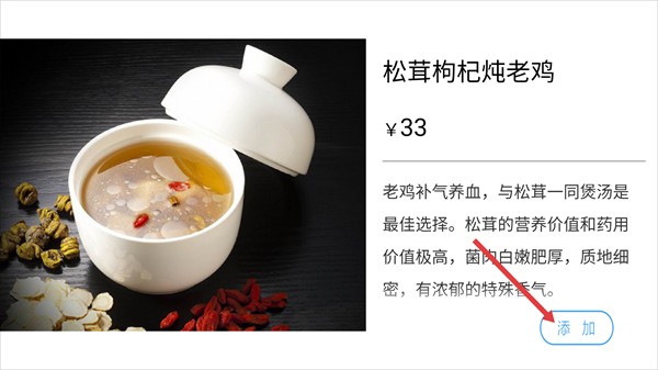4、在菜品详情页面,点击“添加”按钮,将该菜品加入点餐购物车。