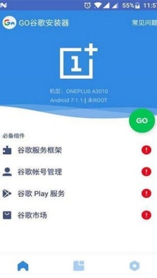 1、打开软件后会自动检测谷歌三件套的安装情况,未安装会显示红色感叹号。