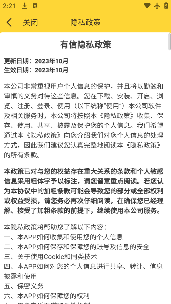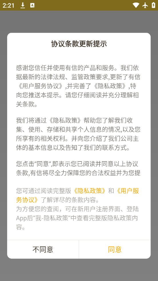 1、打开有信应用,弹出协议条款更新提示弹窗,仔细阅读更新后的用户服务协议和隐私政策内容,点击同意,进入登录引导页面。