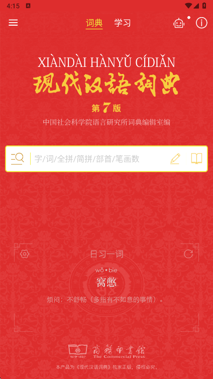 唯一正版《现代汉语词典》App,商务印书馆官方出版,中国社会科学院语言研究所编修,《现代汉语词典》是新中国成立后编写的规范型语文词典,是现代汉语普通话语音规范、汉字规范和词汇规范的主要参考工具书,被誉为汉语辞书史上的一座丰碑。