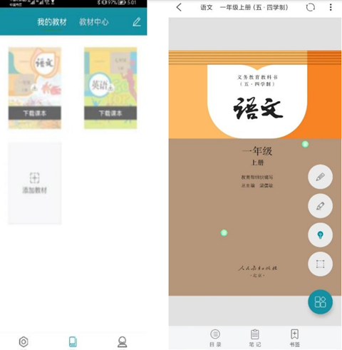 点击【目录】,查看该教材的目录,点击具体目录可切换至相应章节;点击【笔记】,再点击教材页面的目标位置,可在书内进行笔记记录;