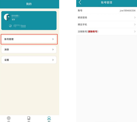 在“我的”页面,点击【账号管理】,进入“账号管理”页面,用户可以查看账号和进行修改密码、绑定手机、注销账号的操作。