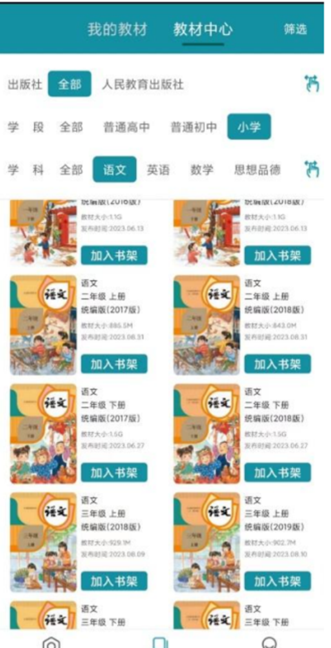 点击右上角【筛选】,可对教材出版社、学段、学科等进行筛选;