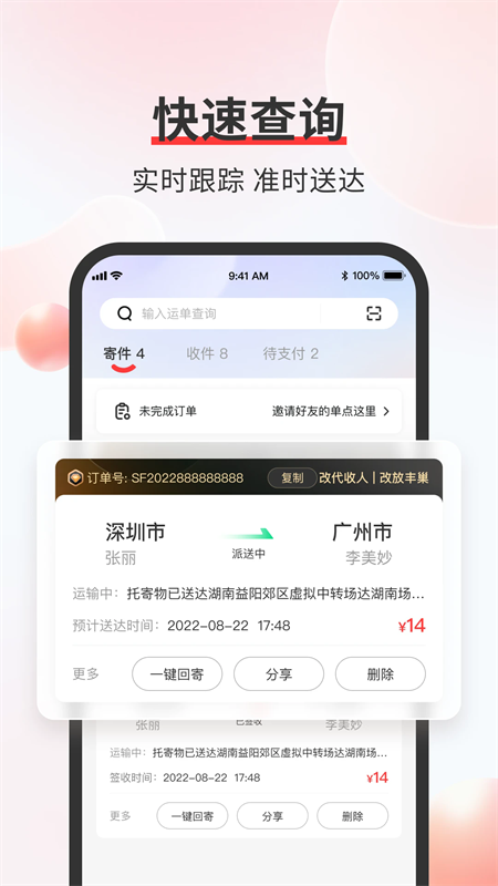 快速查件:快递信息实时更新,在途运输状况自动推送,电商购物、商务文件、大件包裹、退换货送达进度轻松查。