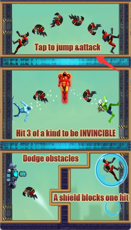 点击游戏画面能够让超人跳转并杀死敌人;连续杀死三个敌人减少你的电力损失;