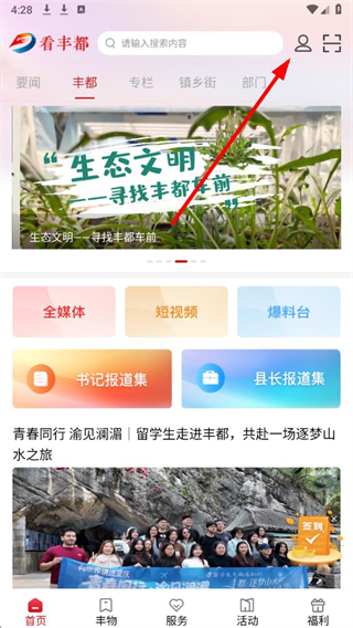 1、进入看丰都app,点击界面右上角个人中心图标,进入个人页面。