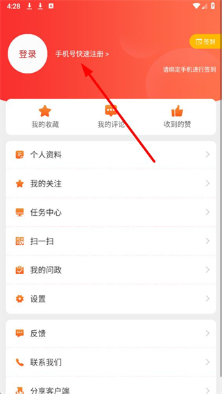 2、在个人页面,点击手机号快速注册选项,进入账号登录界面。