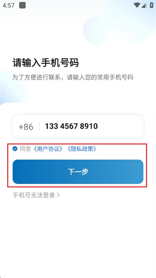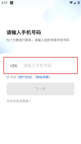 2、进入请输入手机号码页面,在对应输入框中填写常用的手机号码信息。
