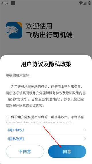 1、打开飞豹出行司机端,阅读用户协议及隐私政策内容,确认后点击同意按钮。
