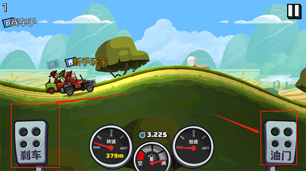 游戏的操作方式是非常的简单的,屏幕右下角的虚拟按键是油门,可以通过按压程度的不同,来给车子进行加速;屏幕左下方角的虚拟按键是刹车,可以对车子进行减速。这个按键还有一个非常大的功能,就是在我们的车子快要翻车的时候,松开油门,点击刹车,就可以矫正我们的车子,使车子不会翻。