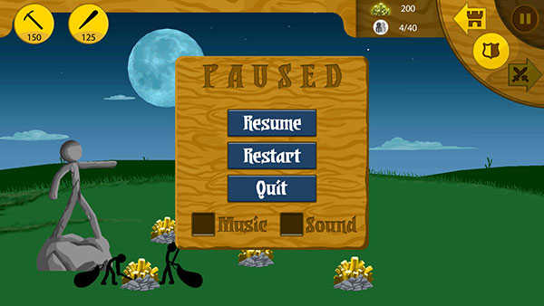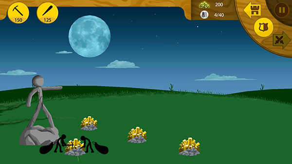 这是一款策略战争类型的游戏,采用了经典的火柴人人物,主要就是两边建造士兵和挖矿工人,发动进攻以及获取金币(没有金币是没办法造士兵的)